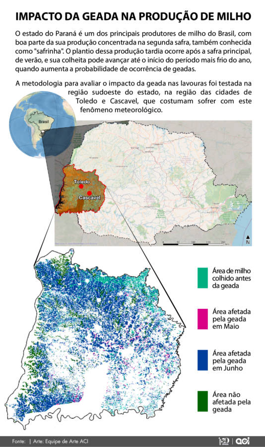 Os pesquisadores usaram como referência para o estudo dados da safra de 2020/2021. Naquela temporada, a região Oeste do Paraná foi afetada por dois episódios de geadas (em maio e junho) que impactaram severamente as lavouras de milho. No início da safra daquele ano, um período de seca mais extensa do que o normal obrigou os produtores a retardarem o plantio da soja da primeira safra, o que atrasou a colheita e, consequentemente, “empurrou” o plantio do milho da segunda safra para meados de fevereiro, levando à colheita para a entrada do inverno, período mais frio.