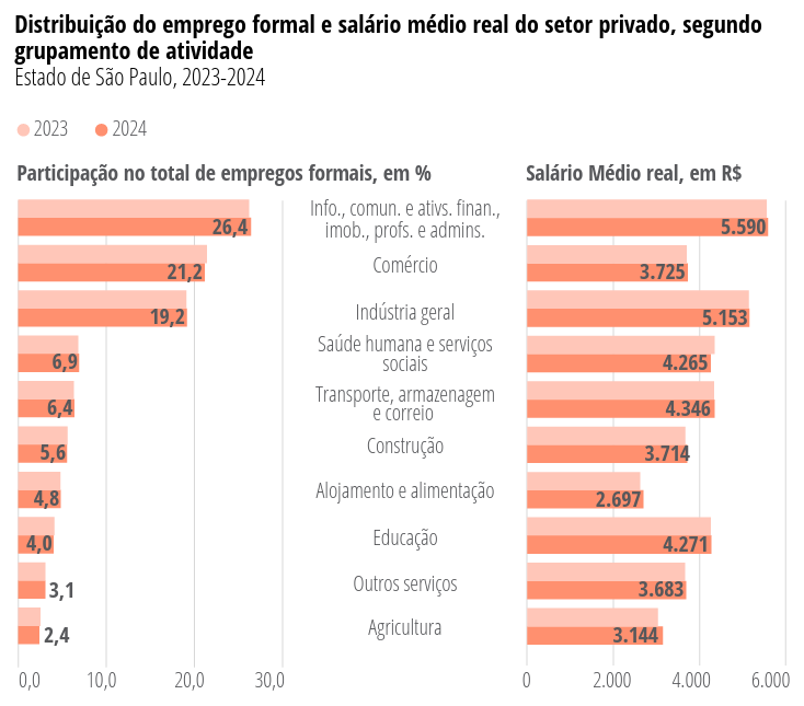 Entre 2023 e 2024, os grupamentos de informação, comunicação, atividades financeiras, imobiliárias, profissionais e administrativas; comércio e reparação de veículos automotores e motocicletas; e indústria geral foram os setores com maior participação no total de empregos formais do setor privado. Os salários médios mais altos foram em informação e comunicação e indústria geral.