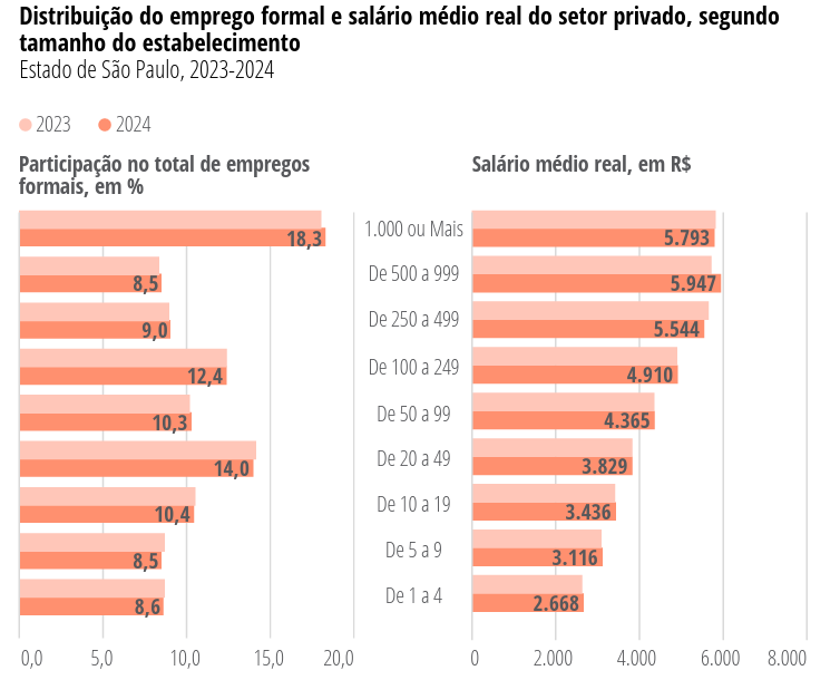 Considerando o porte dos estabelecimentos, os que têm a partir de 1.000 empregados representavam em 2024 18,3% do total de empregos formais no setor privado no estado de São Paulo, seguidos por 20 a 49 empregados, que correspondiam a 14%. Os salários médios dos grandes estabelecimentos foram superiores aos dos menores, excetuando-se aqueles com 500 a 999 empregados: estes registraram salário médio de R$ 5.947, ante R$ 5.793 dos estabelecimentos de 1.000 ou mais empregados.